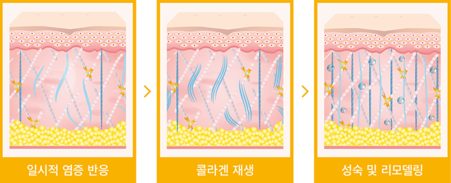 진피 및 SMAS에 생성된 TCP가 콜라겐응고, 변성 및 수축을 유도하면서 나타납니다.